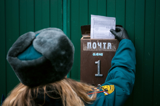 В нескольких домах хозяев либо нет, либо затаились. Звоним, стучим, а в ответ - тишина. Инспектор кладёт памятки в почтовые ящики.