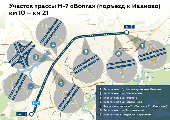 В процессе капитального ремонта М-7 на участке с 10 по 21 км подъезда к Иваново будут ликвидированы пересечения трассы с улицами Ореховая, Белякова и Гастелло. На 7 перекрестках останутся светофоры и левые повороты.