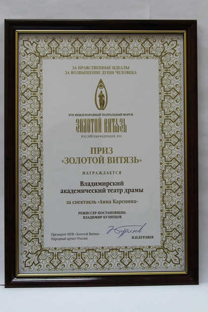 Владимирский академический театр драмы стал обладателем главного приза «Золотой Витязь» XVII Международного театрального форума «Золотой Витязь» за спектакль «Анна Каренина» по роману Льва Толстого в постановке Владимира Кузнецова.