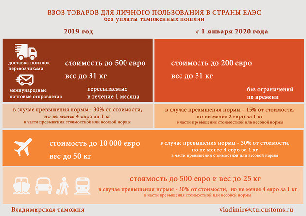 Есть и ещё один «ништяк»: с 1 января 2020 года снижается сам размер пошлины за превышение порога ввоза. Было 30% от стоимости, но не менее 4 евро за 1 кг в части превышения стоимостной или весовой нормы. А станет 15% от стоимости посылки в части превышения, но не менее 2 евро за 1 кг «перевеса» (норма прежняя – 31 кг).