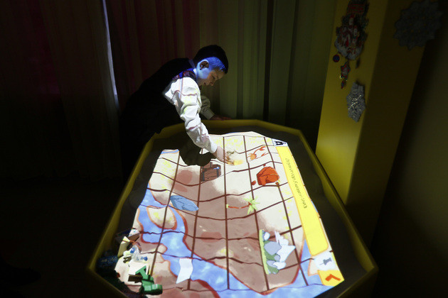 Очень обогатился коррекционно-развивающий комплекс школы, где педагог-психолог Инна Павлухина и дети показали нам удивительные возможности коррекционных занятий. Например, с сенсорным проектором в сочетании с песочной терапией: изображения и развивающие игры появляются перед ребенком на песке. Выполняя задания, ребенок соприкасается с песком, что очень полезно для его моторики и одновременно успокаивает. Еще один сенсорный экран помогает психологу корректировать координацию движений.