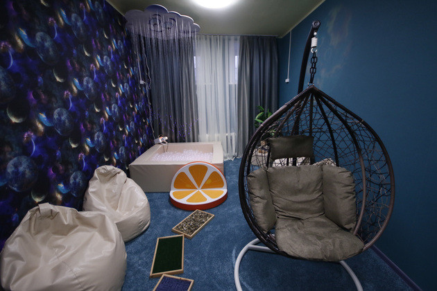 Для отдыха и релаксации, которые тоже необходимы особенным детям, в школе появились сухой бассейн с шариками, воздушно-пузырьковая колонна, электрический массажный коврик с пультом управления.