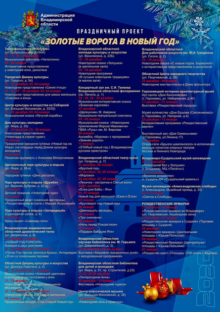 Областной академический театр драмы подготовил для юных зрителей постановку «Питер Пэн против капитана Крюка», областной колледж культуры и искусства покажет музыкально-хореографическую сказку «Золушка», областная библиотека для детей и молодежи приглашает читателей на «Литературную ёлку», а Центр классической музыки устраивает "Новогоднюю ночь в оркестре". Рождественские ярмарки будут работать во Владимире, Суздале и Юрьеве-Польском.