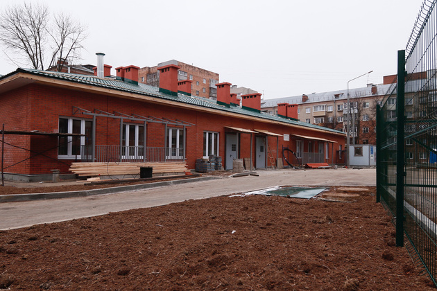 Одноэтажное здание из красного кирпича смотрится как игрушечное, настолько удачно и компактно оно вписалось сюда. Основные строительные работы закончены, идет стяжка полов, поэтому гостей внутрь не пустили, но рассказали, как тут будет жить детвора. Внутри помещения для двух больших групп, два зала, пищеблок.