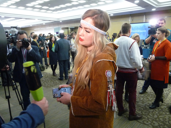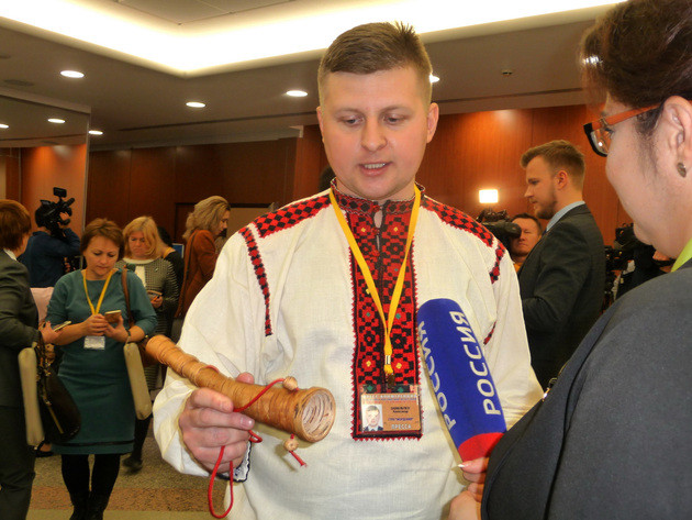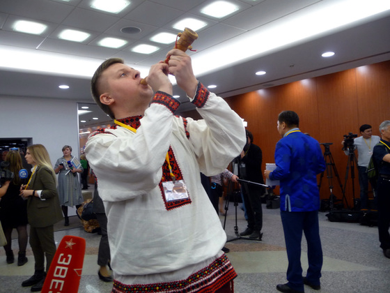 Обратить на себя внимание ведущего Дмитрия Пескова и самого Владимира Путина — особое искусство. Журналисты используют все способы: размахивают плакатами, допускают выкрики с места и даже облачаются в костюмы народов мира! Например, Александр Данильчев из Мордовии был наряжен в рубаху с узнаваемым мордовским орнаментом. А ещё он оглашал нижнее фойе пронзительными звуками рожка, распространенного у народов эрзя и мокша. Правда, вблизи конференц-зала и во время общения с президентом дудеть в рожок Александру не рекомендовали, но он очень хотел показать народный инструмент Путину.