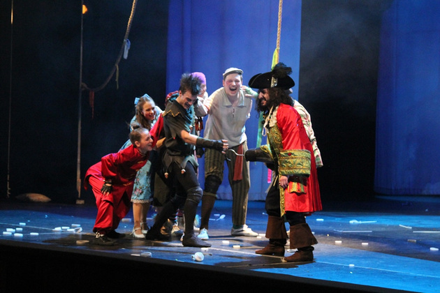 Признаться честно, такой легкой, воздушной и обаятельной труппу Драмтеатра можно встретить нечасто. Детский спектакль обязывает. Даже отрицательные герои — а ведь их так любят дети — были необыкновенно привлекательными и смешными. Кровожадного капитана Крюка, например, запросто утащило не морское чудовище, а всего лишь милая русалка. Ей предводитель пиратов сдался, что называется, без боя. Персонаж получился далеко не страшным, а скорее - наивным и романтичным. Из «пены морской» он появился без своей пиратской одежды и вовсе очаровал публику. Кажется, он взял что-то и от обаятельного капитана Джека Воробья.