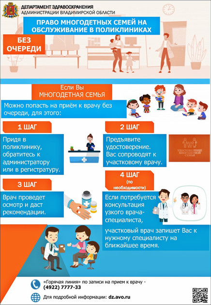 Для того чтобы реализовать своё право на обслуживание вне очереди, необходимо обратиться к медицинскому регистратору поликлиники или к администратору, предъявив удостоверение многодетной семьи.
