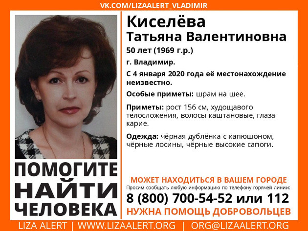 Во Владимирской области поисковый отряд «Лиза Алерт»» объявил в розыск 50-летнюю Татьяну Валентиновну Киселеву. По данным из открытых источников, она - заведующая ДОУ №95 на улице Растопчина в областном центре.