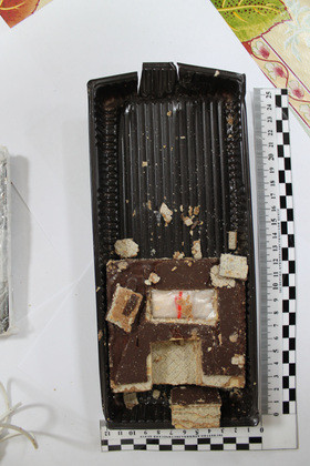 При досмотре почтовой бандероли на имя одного из осужденных в вафельном торте «Шоколадница» было обнаружен тайник с запрещенными предметами.