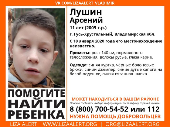 Поисково-спасательный отряд "Лиза Алерт" во Владимирской области просит жителей региона оказать содействие в поисках пропавшего Арсения Лушина из города Гусь-Хрустальный. Местонахождение 11-летнего ребенка неизвестно с 18 января.