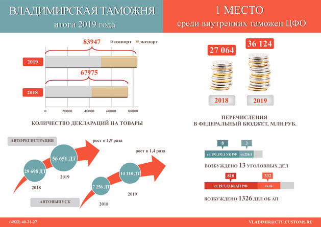 Всего в прошлом году владимирские таможенники зарегистрировали 84 тысячи деклараций на 192 тысячи наименований товаров. В федеральный бюджет перечислили больше 36 миллиардов за двенадцать месяцев. Выявили около 12 тысяч единиц контрафакта (одежда, обувь, сумки, часы). Возбудили 13 уголовных дел по нарушениям валютного законодательства и незаконному перемещению через таможенную границу наркотических средств и стратегически важных ресурсов (леса) в крупном размере.