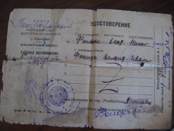 ... Потертое от времени удостоверение о том, что они с мамой эвакуированы из блокадного Ленинграда, Валентина Ивановна хранит до сих пор. Выдан документ 8 апреля 1942 года Петроградским райсоветом. Именно тогда они, ослабевшие от голода, решились уехать из города. Их перевезли на машине по льду Ладожского озера, по той самой "дороге жизни".