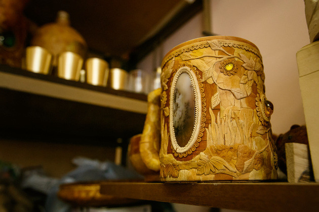 - У меня были разные заказы - от миниатюрных наперстков до двухметровых зеркал. Для украшения интерьера я изготавливал зеркало в прихожую. Высота его была больше двух метров. Зеркало в виде дерева, ветви которого украшены яблоками из янтаря и цветами из агата. Такой союз бересты и самоцветов — самый неповторимый и гармоничный. Над этим заказом я работал 8 месяцев. Стоимость этого изделия - 650 тысяч рублей.