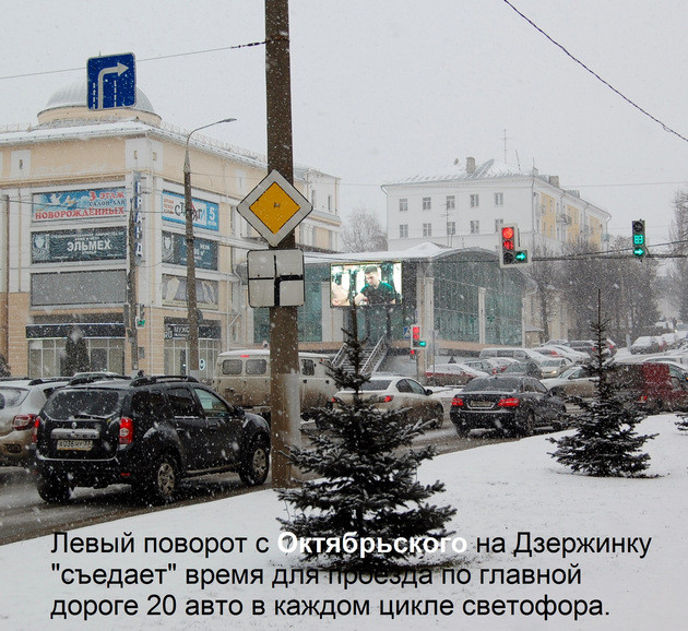А вот «тромбоопасное» место номер два – перекрёсток Октябрьского проспекта с ул. Дзержинского – вполне возможно «вылечить» малой кровью. Предлагаю несколько малобюджетных идей для разгрузки этого перекрёстка. Здесь хронические пробки запрограммированы режимом работы светофора: на главном направлении (поворот с Дзержинки при движении со стороны Студёной горы на Октябрьский) зелёный сигнал светофора горит 37 секунд, а красный – 121.
