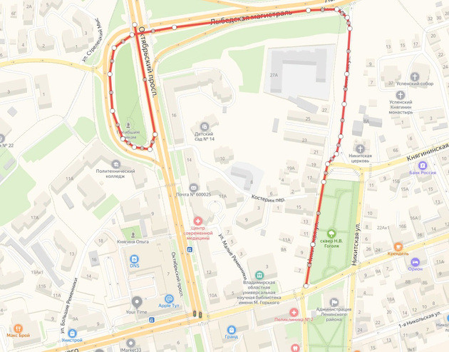 В любую точку центра города можно попасть с Октябрьского проспекта, развернувшись под эстакадой и свернув на Никитскую