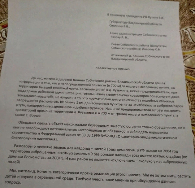 "До нас, жителей деревни Конино Собинского района Владимирской области, дошла информация о том, что в непосредственной близости (700 метров) от нашего населенного пункта, на территории бывшей воинской части в деревне Кузьмино, некие предприниматели готовы начать строительство крематория областного или даже зонального масштаба, не взирая на то, что нормативы строительства подобных объектов запрещают располагать подобные предприятия ближе 1 км до населённых пунктов из-за неизбежности выбросов паров ртути, канцерогенных диоксинов и дибензофуранов" - говорится в опубликованном в социальных сетях объявлении.