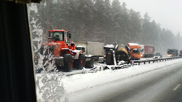 Днем 29 января из-за опрокинувшейся крупногабаритной техники на трассе образовалась многокилометровая пробка. Добавляют проблем и погодные условия, обильные снежные осадки.