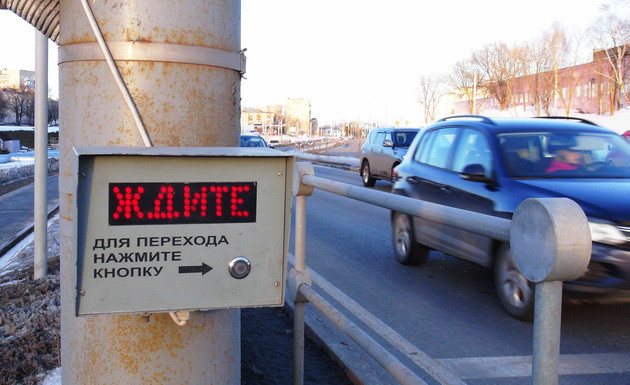 Чем этот переход лучше двух других на магистрали, оставленных нерегулируемыми? Непонятно. Кстати, на целом ряде переходов нужны именно такие светофоры, с кнопками, – там, где пешеходы достаточно редки (и это тем более для них опасно!). Чтобы не останавливать там впустую поток машин, как раз и нужны кнопки.