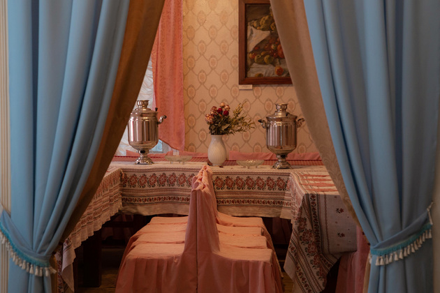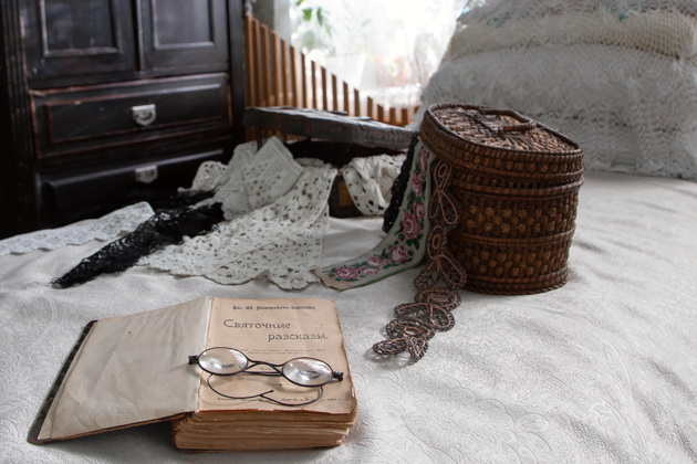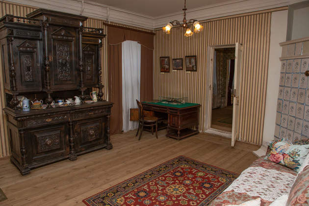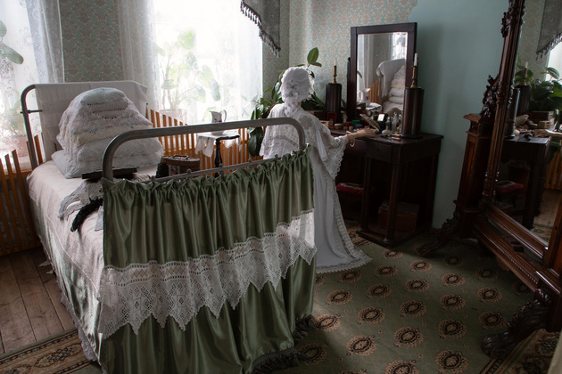 Она же в музее и главная швея: шляпки, костюмы — ее работа. Людмила Александровна ведет нас по комнатам. Анфилада первого этажа - «личное пространство»: приемная, рабочий кабинет, диванная, спальня. Сейчас музейщики готовятся расширять экспозицию, обустраивают детскую комнату.