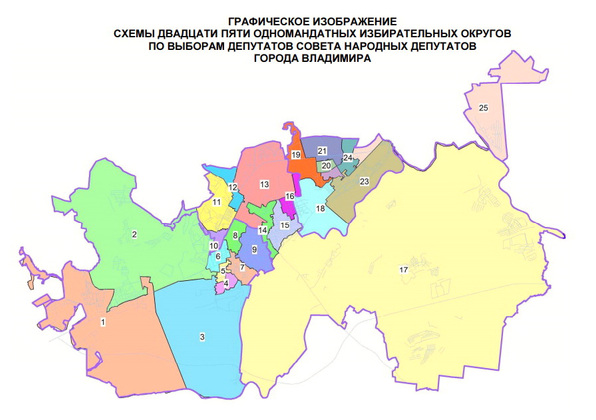 274 тысячи Владимирских избирателей поделили на 25 равных частей по территориальному признаку. Текстовое описание границ округов можно посмотреть здесь. Подробнее о выборах в Горсовет Владимир Кузьмин обещал рассказать после голосования по изменениям в Конституцию РФ.