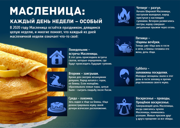 Понедельник – встреча Масленицы. Обычно в этот день происходила встреча сватов, которые определяли, где будут происходить будущие гуляния.