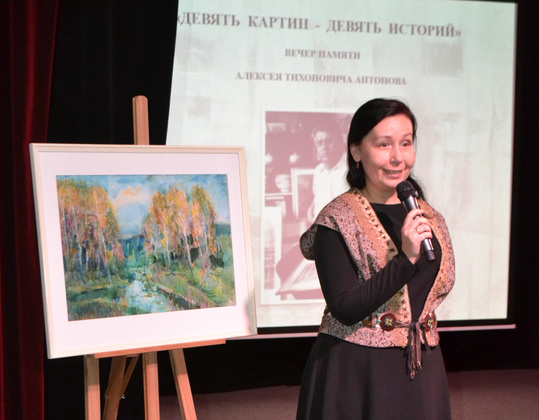 Автором и ведущей вечера выступила дочь Алексея Антонова Людмила Кошелева (Антонова) – художница, доцент ВлГУ, исследовательница творческого наследия отца. По признанию Людмилы Алексеевны, она пошла на эксперимент, построив вечер из девяти небольших интересных историй, которые прозвучали на фоне девяти картин Алексея Тихоновича Антонова.