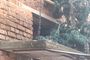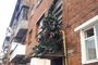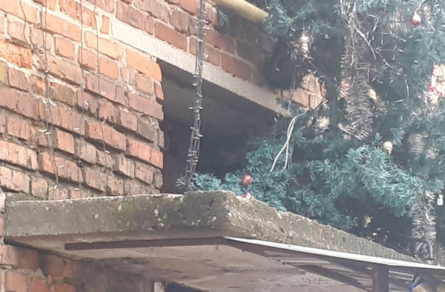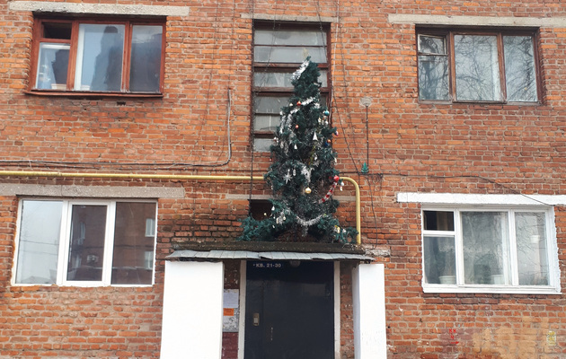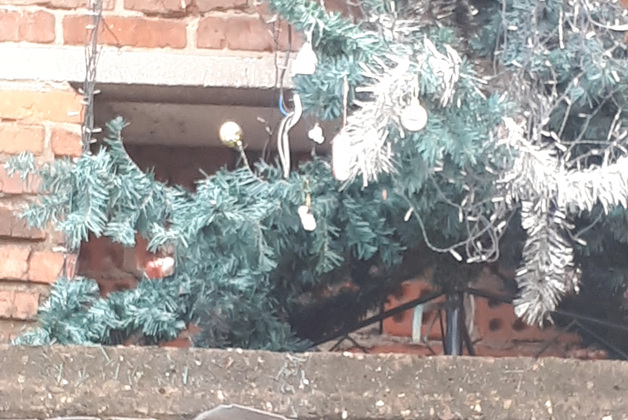 Но когда я подошла ближе, выяснилось, что ёлка в мишуре на фасаде дома выполняет важную миссию - прикрывает от глаз прохожих большое отверстие в стене. Когда-то там было окно, но изнутри оно кое-как заложено кирпичом (небрежность кладки видно даже за еловыми лапами), а с фасада зияет чернотой.