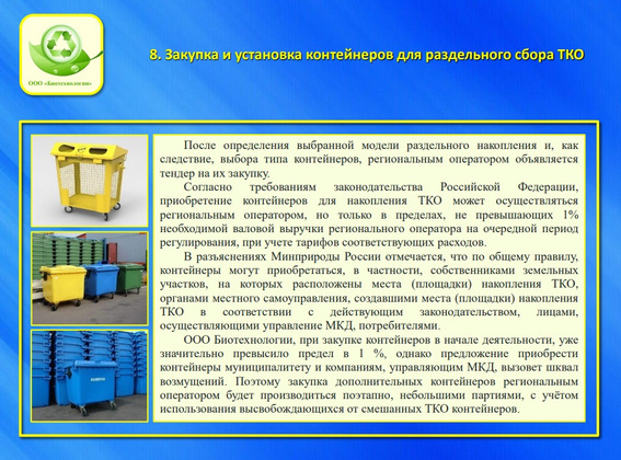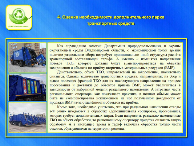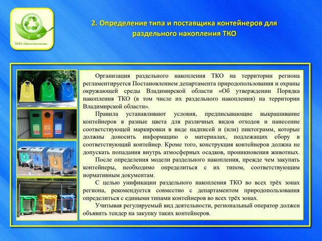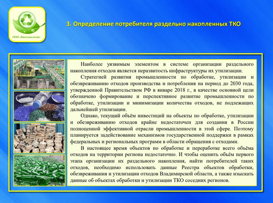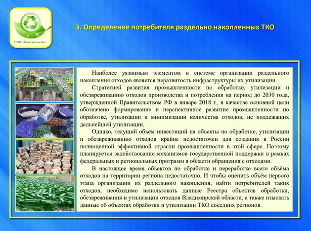 Региональный оператор в зоне №2 во Владимирской области считает внедрение раздельного сбора отходов своей стратегической задачей. Компанией «Биотехнологии» ведется постоянный поиск новых инвестиционных идей для увеличения доли переработки вторсырья.