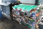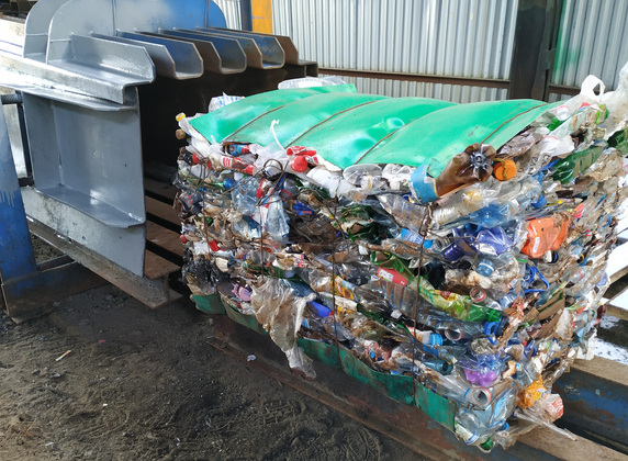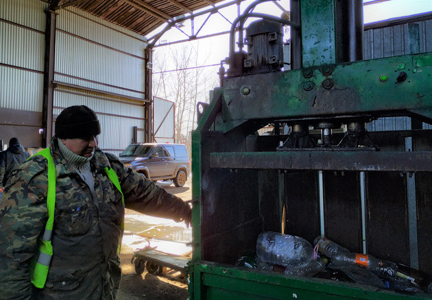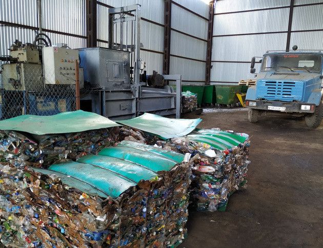 Бутылки, коробки, банки поступают на опрессовку. Вес каждого спрессованного «куба» - несколько десятков килограммов.