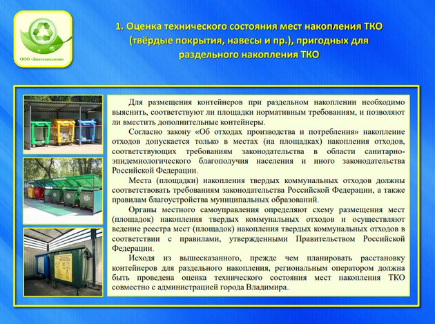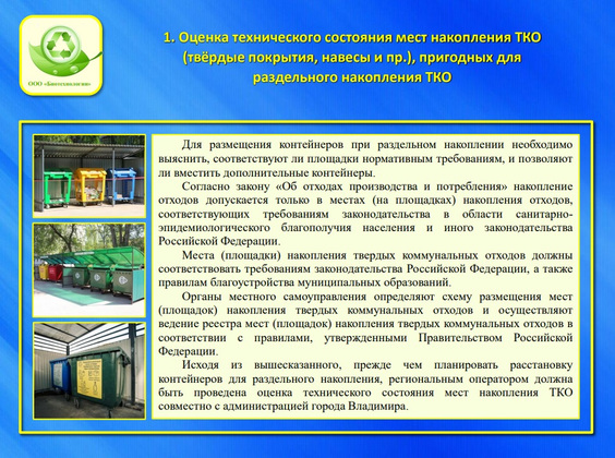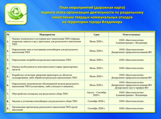 Разработана «дорожная карта» - обоснованный план мероприятий первого этапа организации раздельного накопления ТКО на территории города Владимира. Проект «дорожной карты» направлен в департамент природопользования и охраны окружающей среды, департамент цен и тарифов и в мэрию областного центра.