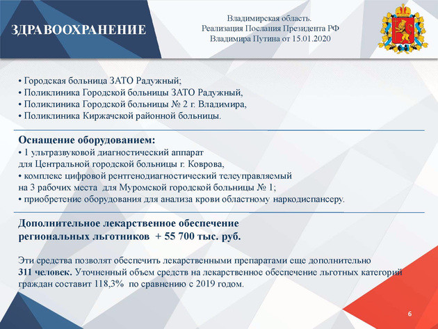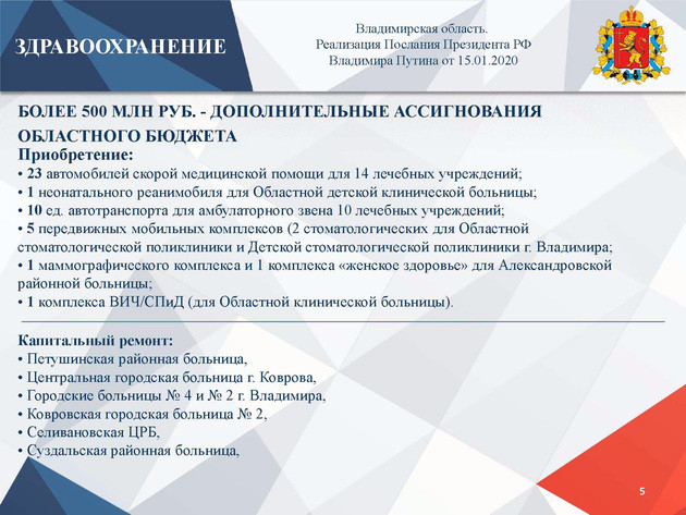 Кроме того, запланирован капитальный ремонт Петушинской районной больницы, ЦГБ Коврова, ГБ №2 и ГБ №4 Владимира, ГБ №2 Коврова, Суздальской районной больницы и Селивановской ЦРБ, Городской больницы в Радужном, поликлиник во Владимире и Киржаче.
