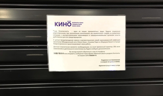 Ковровские киноманы выложили в общественном паблике информацию о том, что "кина не будет". Однако частные коммерческие структуры, в том числе развлекательные центры, обязать к закрытию никто не может. Решение остается за владельцами. Ковровчане одними из первых приняли решение о том, что проводить массовые киносеансы небезопасно.
