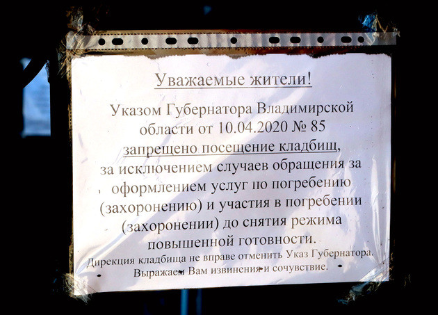 «Да, немного людей сегодня, – подтвердил постовой, лицо которого прикрывала элегантная черная маска, очень даже соответствующая полицейской форме. Он же отсоветовал ездить на кладбище в Высоково (Улыбышево), поскольку в соответствии с указом губернатора туда уж точно никого не пустят. Да и так было понятно, что вряд ли сейчас можно было ожидать массового выезда на кладбища. – «И старое кладбище во Владимире закрыто», – заверил полицейский.