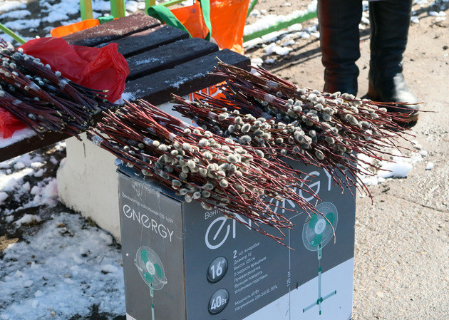 Впрочем, можно было заметить несколько человеческих фигур возле Успенского кафедрального собора. По дороге к главному храму губернии стояли гражданочки, торговавшие веточками вербы на коробках из-под вентиляторов. Верба была просто роскошная: стебли малиновые, цветочки пушистые, как с куста! Но покупателей не было! «Берут вербочку?» – спросил я у товарок. «Ну, как же, берут-берут», – начала было одна. «Да, куда там! Сами видите – никого нет! Распугали народ этим коронавирусом!» – запричитала другая. Судя по огромным запасам товара, реализовать его ей удастся вряд ли. Тем более, что в Успенском соборе уже началась вторая литургия.