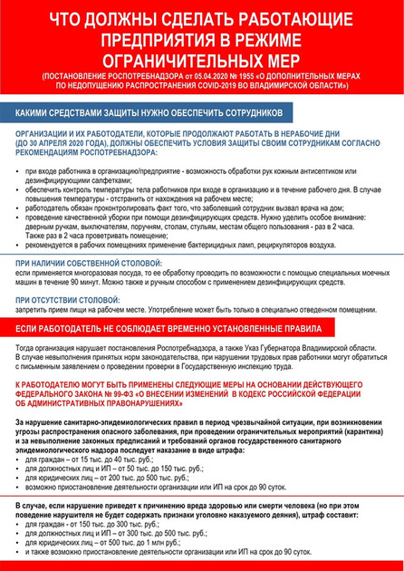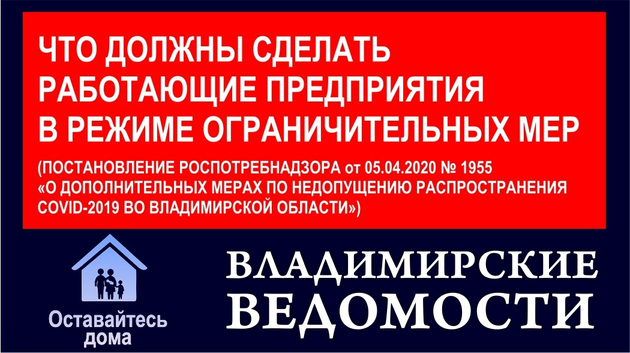 Администрация Владимирской области совместно с нашим изданием разработала памятку для предприятий и организаций, работающих во время действия ограничительных мероприятий из-за коронавируса.