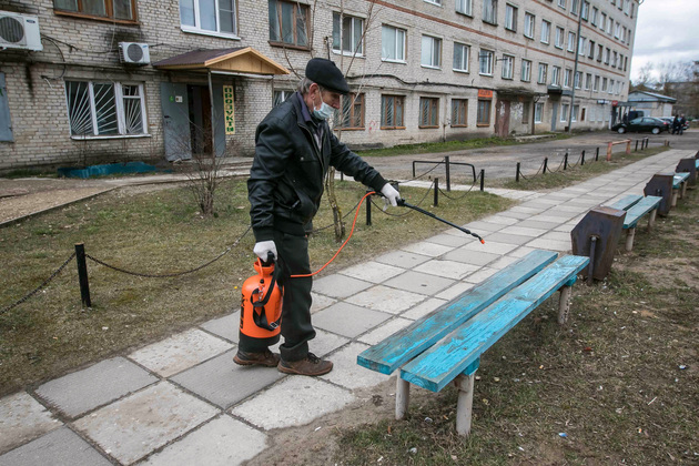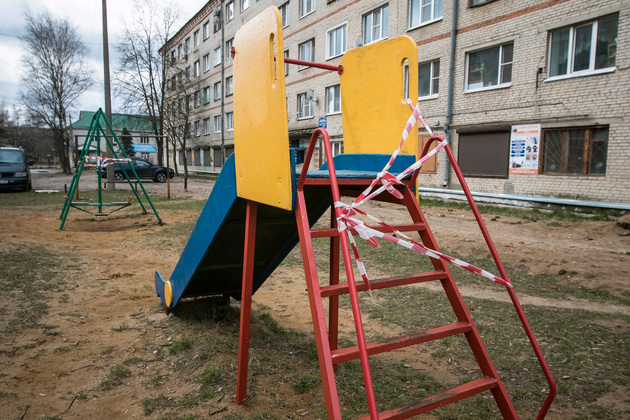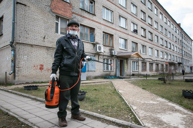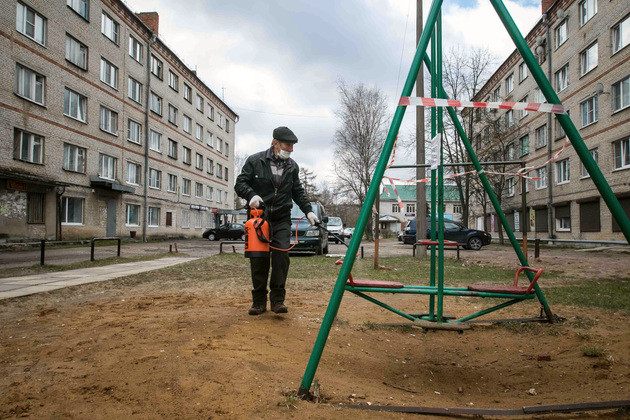 Мы без преград заехали в крупный поселок Вольгинский, где увидели веселого мужчину, орошавшего дезинфекцией детскую игровую площадку. Зачем он это делал, было не совсем понятно: вся площадка была обмотана красно-белой лентой, означавшей, что детям на нее – нельзя.