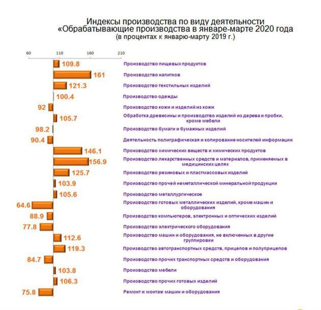 В сравнении с январем-мартом-2019 наши производственники сработали с плюсом в 2,8%. Причем у упомянутого главного сектора — обрабатывающих производств плюс еще существеннее: 3,6%.