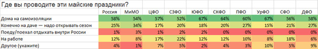 Наименьший процент тех, кто готов остаться на майские праздники в домашнем карантине, показали Северо-Западный федеральный округ (52 %), а также Москва и Московская область - 54 %. Больше всего домоседов — в Уральском и Южном Федеральном округах (по 67 %). В остальных федеральных округах эта доля варьируется от 56 % до 64 %.