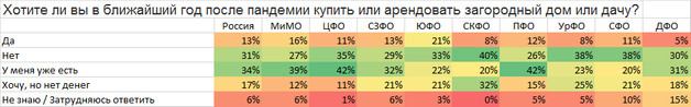17 % респондентов хотели бы обзавестись дачей в ближайший год, но у них нет на это денег. Наиболее высока доля желающих, но не имеющих финансовых возможностей купить себе загородный дом, на Кавказе (32 %) и на Урале (25 %). Меньше всего тех, кто не может позволить себе дачу из-за материальных трудностей, в Центральном федеральном округе - 11 %, а также в Московском регионе - 12 %.
