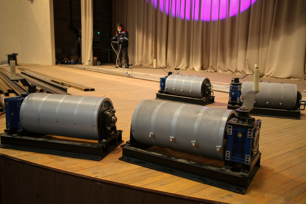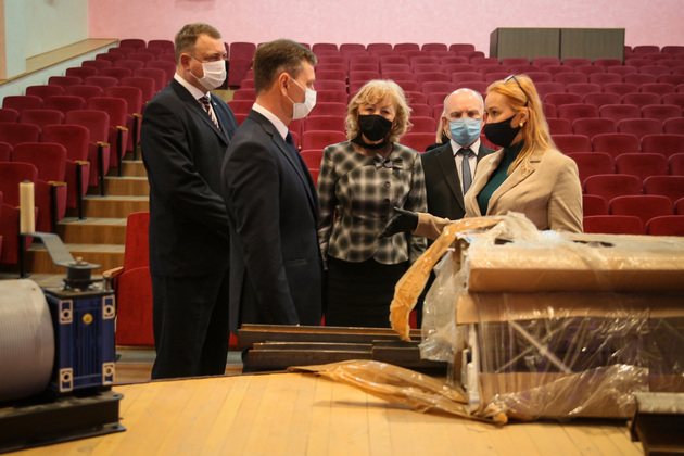 С ходом работ и прибыл ознакомиться губернатор Владимир Сипягин. В зрительном зале как раз продолжался монтаж звукового, светового оборудования и так называемой одежды сцены. Это завершающая стадия.