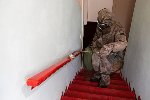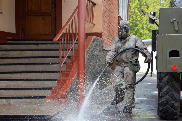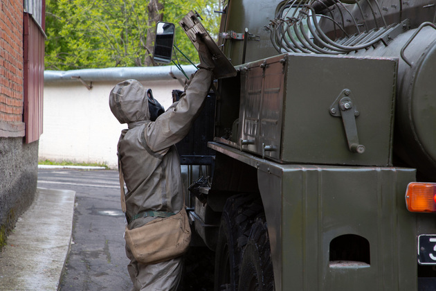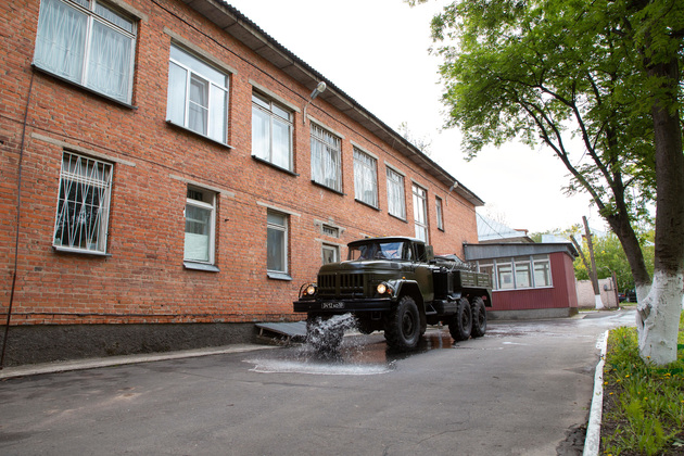Автоцистерна въехала во двор сборного пункта. И сопровождающие ее военные, облачившиеся в костюмы химзащиты, специальным дезинфицирующим раствором ДТСГК провели санитарную обработку. Дезинфекции подверглась прилегающая территория здания, его стены снаружи и помещения внутри — кабинеты, коридоры, лестницы, где будут находиться ребята-призывники.