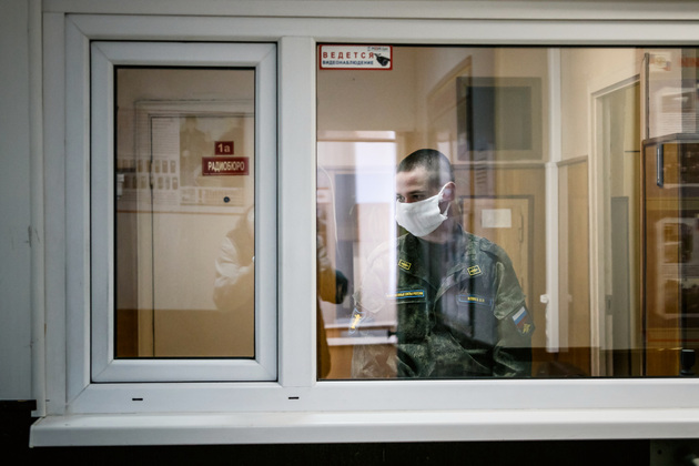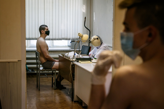 Накануне сборный пункт был тщательно продезинфицирован. Призывников запускали по одному и в масках. Сначала в лабораторию с отдельным входом, где проводили тестирование на наличие коронавирусной инфекции.