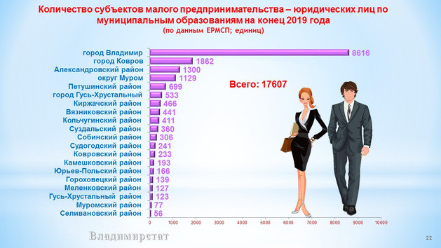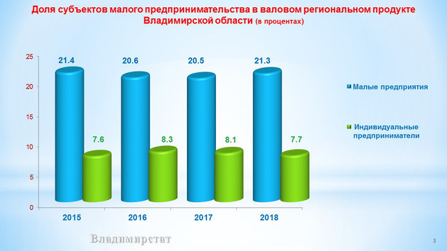 При этом, по словам руководителя Владимирстата Александра Быкова, по прежнему высока доля малого бизнеса в оптовой и розничной торговле, ремонте авто и мотоциклов – практически треть всех предприятий. А нам хотелось бы, чтобы малый бизнес активнее развивал производственную сферу. Пока в общем числе МБ предприятия обрабатывающих производств составляют лишь 14,2 % от общего числа. Еще 12,1% - это строительные компании, еще 10,6% - предприятия, осуществляющие деятельность по операциям с недвижимым имуществом.