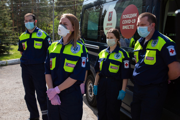 Всего в сводной бригаде медиков Москвы шесть специалистов. Они прибыли на специальном микроавтобусе, все они в униформе с эмблемами Департамента здравоохранения Москвы.