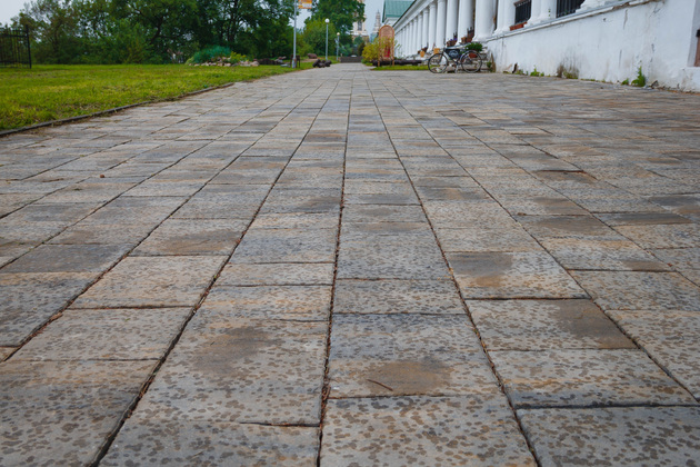 Подрядчик частично выравнял плитку и засыпал межплиточные швы песком. Но дожди остановили работы. Как только погода позволит, подрядчик выйдет на объект.