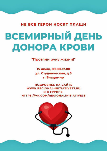 Акция состоится 15 июня с 9 до 12 часов на базе областной станции переливания крови (г.Владимир, ул. Студенческая, 5). Организатор - ВРОО «За развитие регионов "Региональная инициатива».