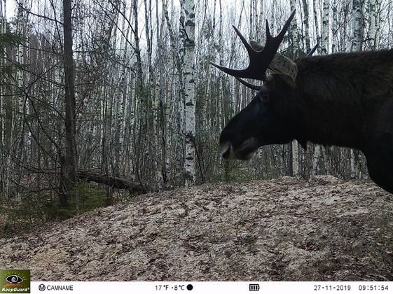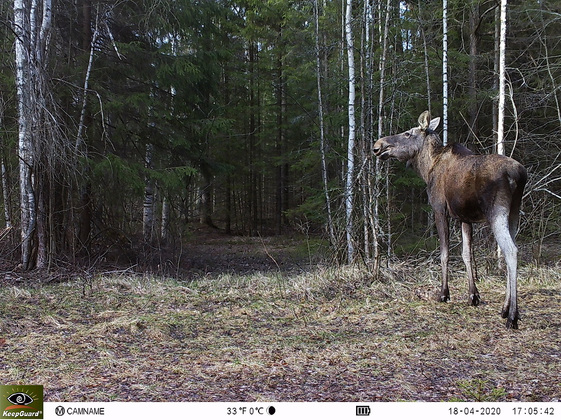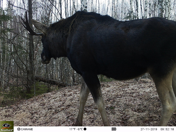 В конце апреля косолапого запечатлела ловушка. Сначала на изображении появился лось, а за ним в качестве преследователя двигался мишка. Весной, после спячки, медведи просыпаются голодными, весь жир у них израсходован а еды в лесу нет. Поэтому им приходится охотиться даже на копытных животных. Так что преследовал медведь сохатого не ради того, чтобы размяться. А через четыре дня после этого совсем свежие следы обнаружили на лесной дороге примерно в 20 км от места, где медведя заcняли на фотоловушку.