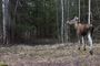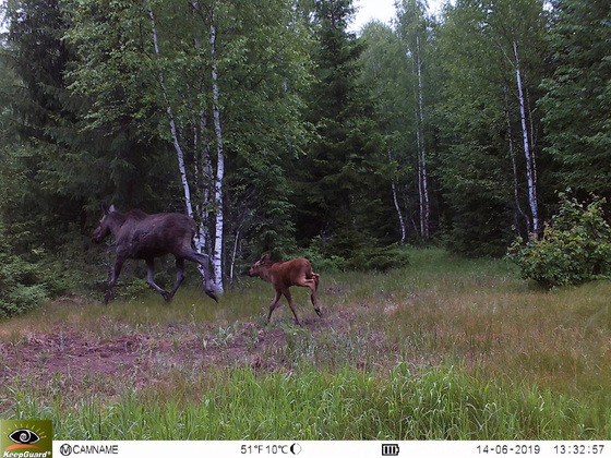 Зайцы тоже часто попадают в кадр. Они очень уязвимы в белом наряде в зиму без снега. Но сейчас шубки уже серые. Весной у зайчих появляются маленькие зайчата. Эти сидят, затаившись в траве, потому что плохо бегают и им опасно показываться на глаза вообще кому-либо… Лоси же, наоборот, бегают с рождения. Телята встают на ноги и семенят за мамой. В мае в кадр ловушки попала лосиха с таким семенящим маленьким лосенком.