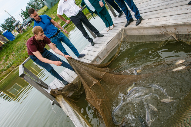 В прудах, которые основаны на природных родниках, уже вовсю подрастает множество особей осетровых пород и форели. Губернатор осмотрел пруды с рыбой. Они требуют еще технического оснащения аэраторами и другим оборудованием. Дмитрий Самодуров надеется на государственное софинансирование рыбоводческого проекта по программе «Агростартап» и представил губернатору свои расчеты прямо на берегу одного из прудов.