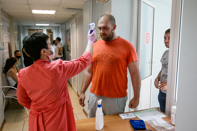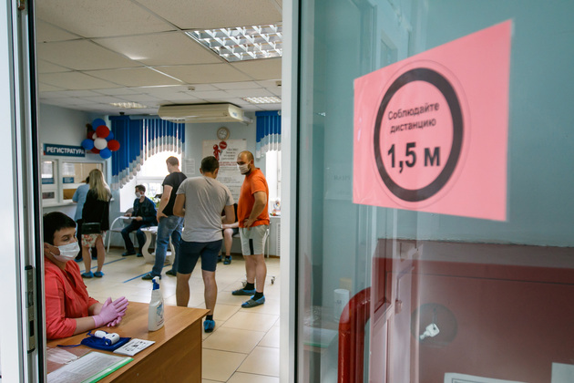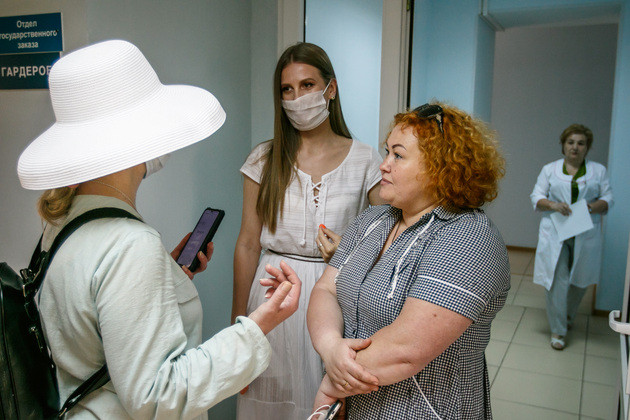 На входе в помещение всем измеряют температуру, дезинфицируют руки и выдают маску, если нет своей. Затем отправляют в гардероб за бахилами. В таком виде уже можно идти к окошку регистратуры.